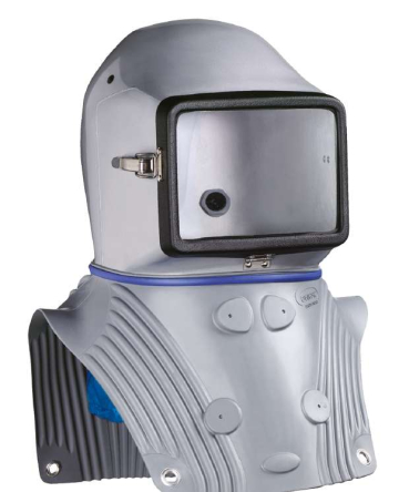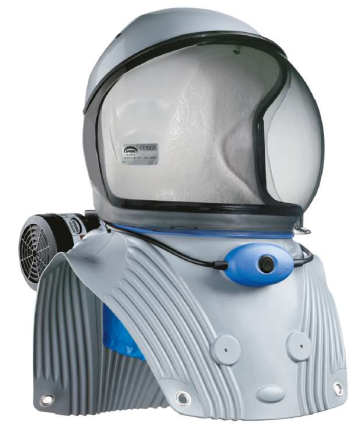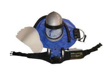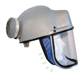 Spring Agrofilter helmet is a battery powered pressurized spray helmet. The fan and three filters are carried on a waist belt. The battery lasts for up to 7 hours of service on a 10 hour charge. Three replaceable filter cartridges remove the spray vapours upon entry, Then the filtered air flows over the top of the helmet and down in front of the face mask. This keeps the helmet cooler, and the facemask from fogging up.